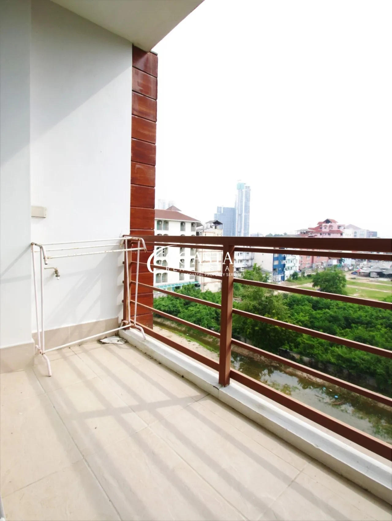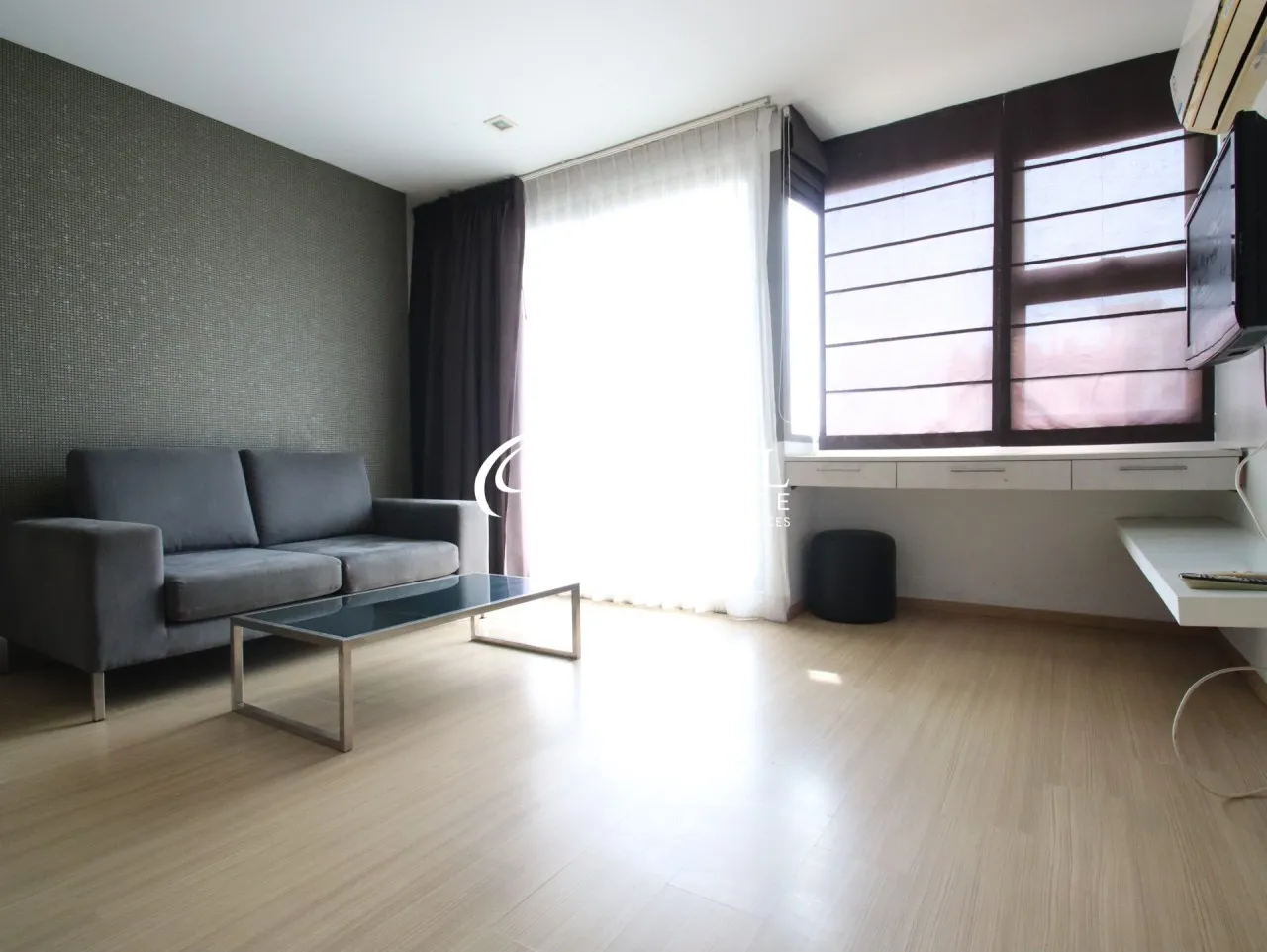 The condo has a smart design with wooden laminate flooring and a private balcony overlooking the city.