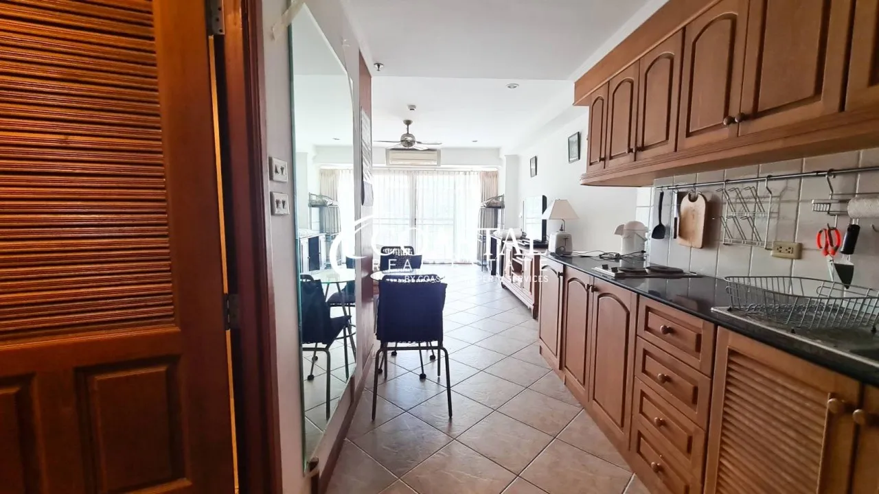 Introducing a charming 48 square meter studio condo for sale in the View Talay 5C building, located in Jomtien. This fully furnished unit offers stylish finishes, including a sleek European kitchen, and tiled floors, offering a blend of comfort and style.