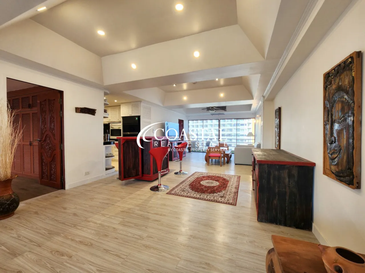 This spacious 2-bedroom, 1-bathroom condo is fully furnished and ready for immediate move-in. Located in the highly sought-after Chateaudale complex in Jomtien, the unit offers a generous 138.91 SQ.M. of living space. The European-style kitchen comes equipped with modern appliances, including an oven and dishwasher, perfect for those who love to cook.