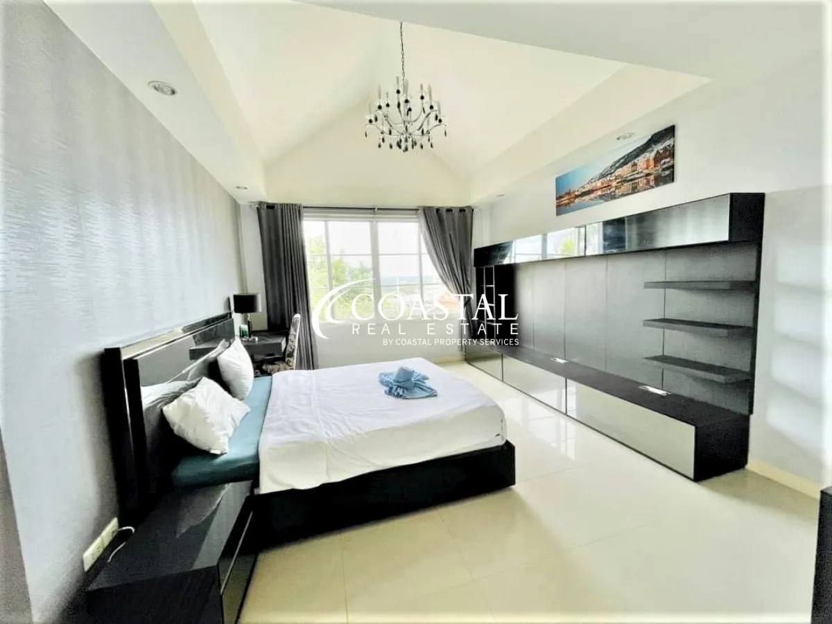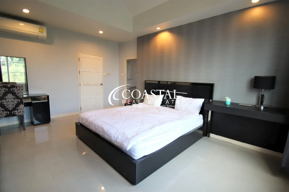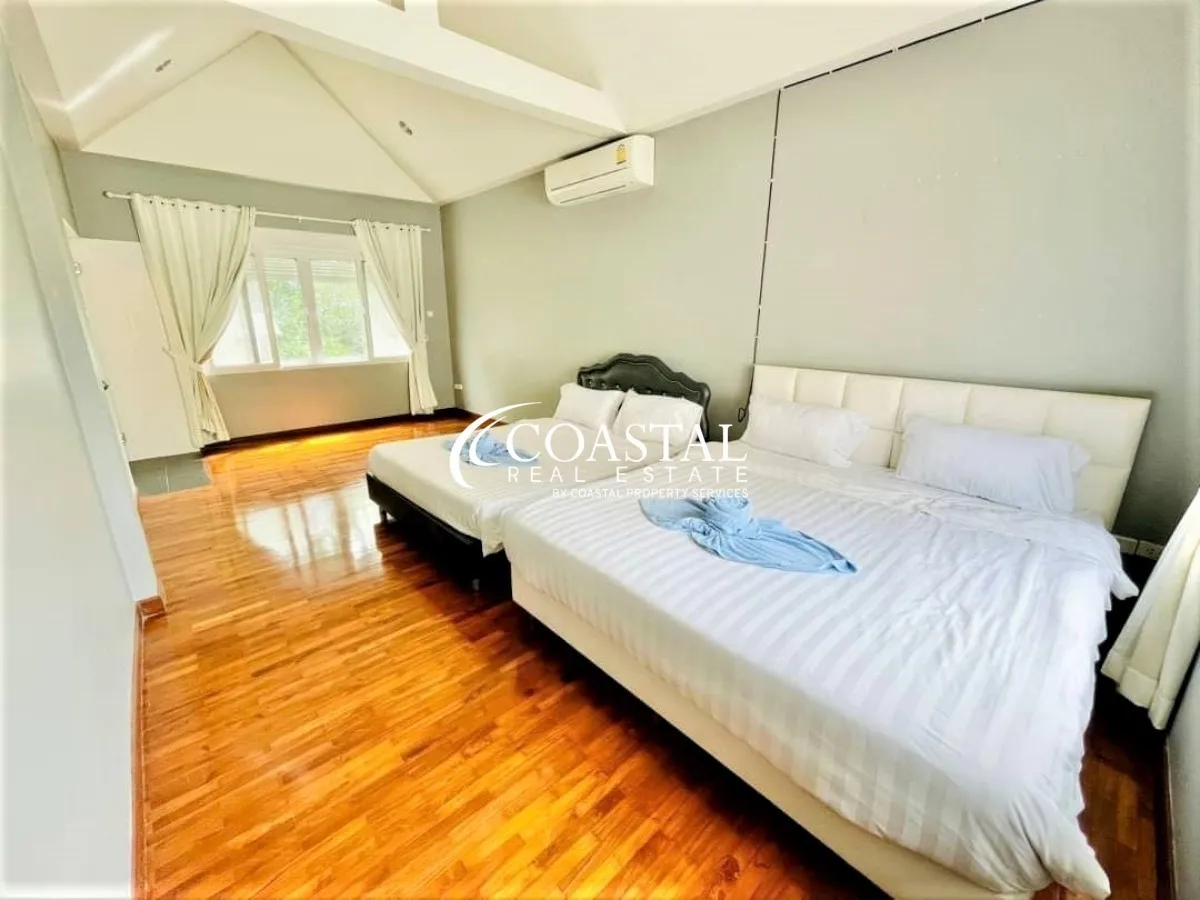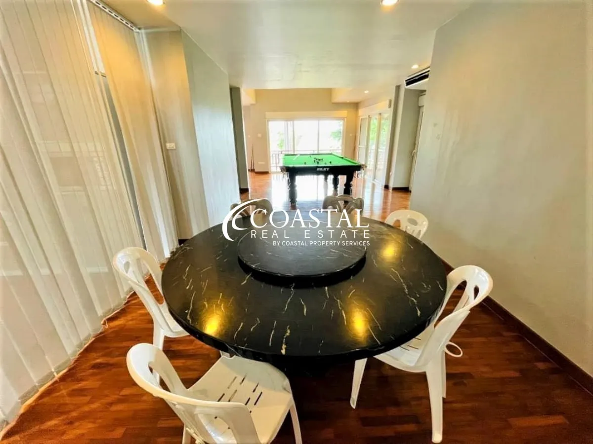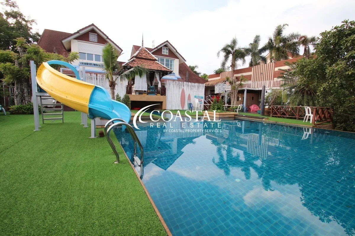 The 2 storey, house has 5 bedrooms, 7 bathrooms, a European & Thai kitchen, spacious living area, storage room, and an entertainment room.