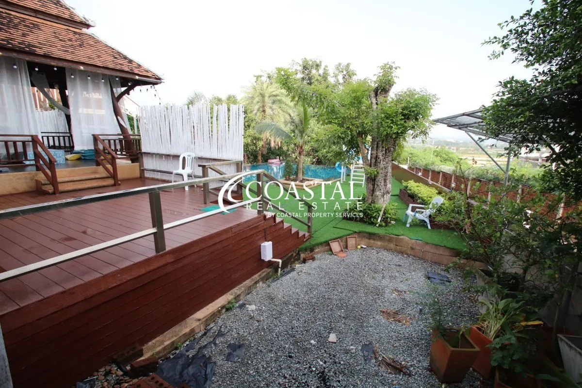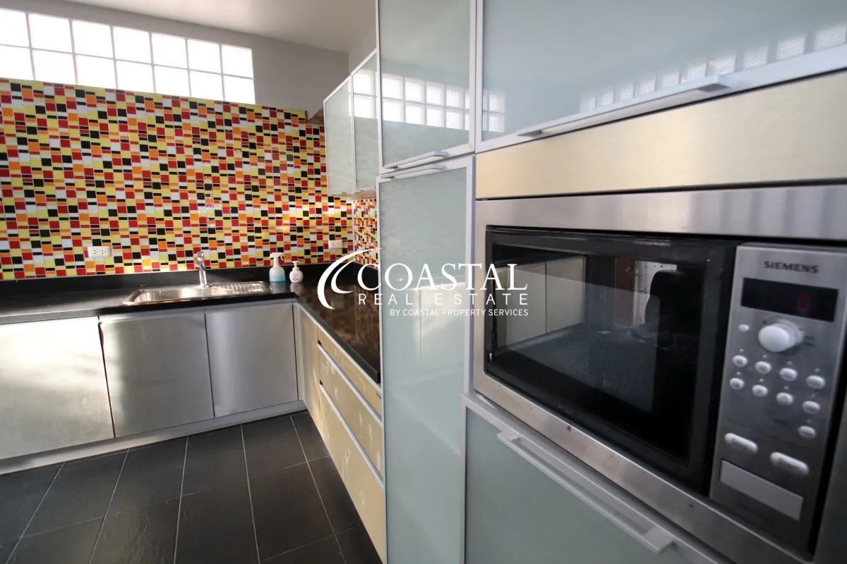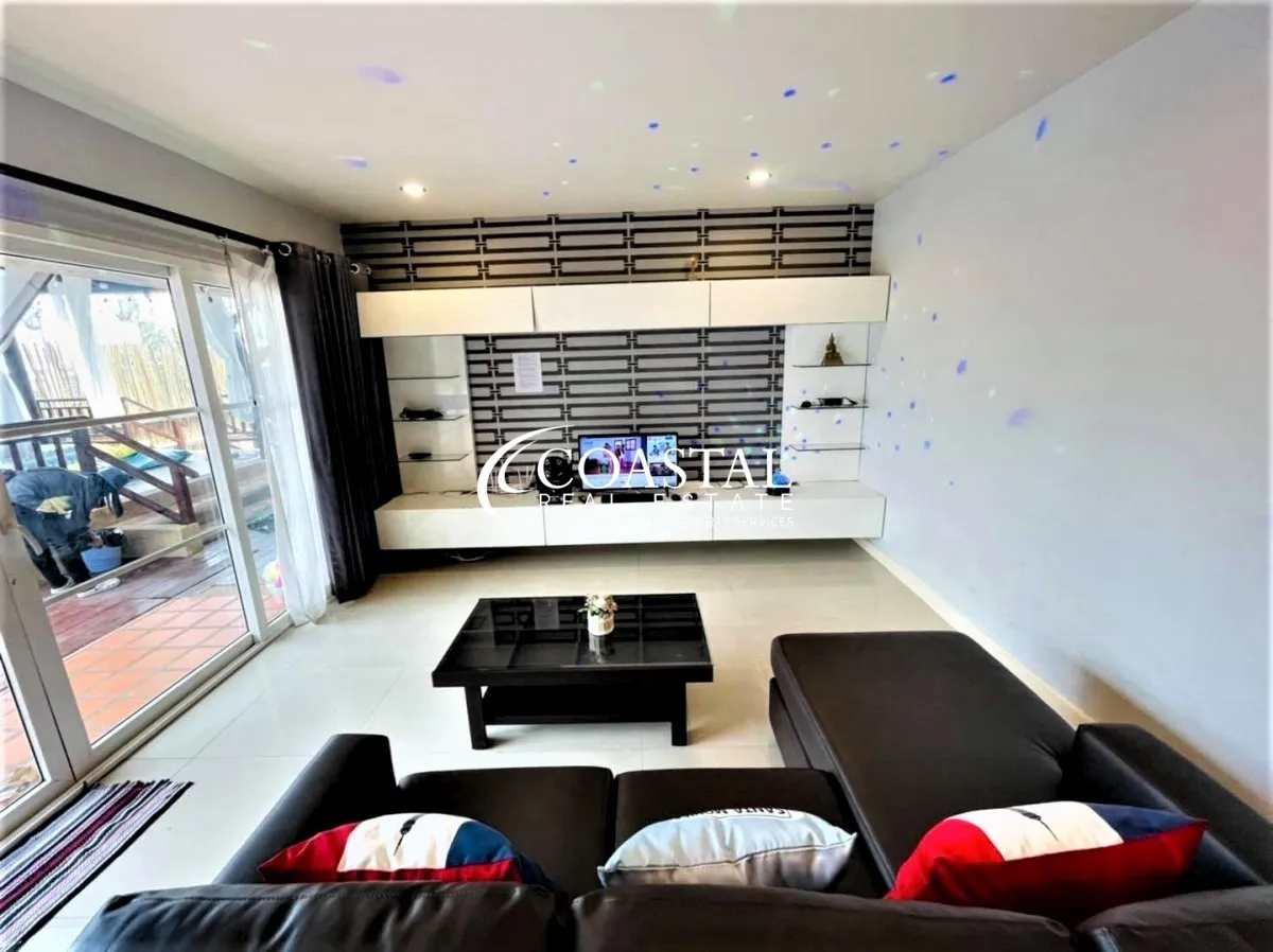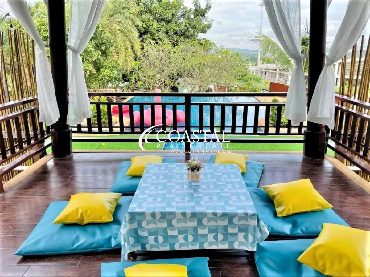 The 2 storey, house has 5 bedrooms, 7 bathrooms, a European & Thai kitchen, spacious living area, storage room, and an entertainment room.